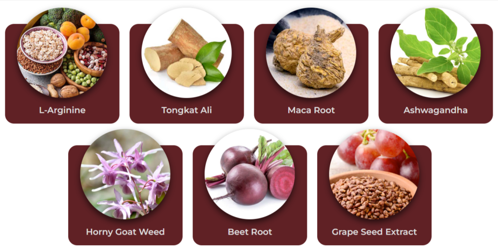 Its formula includes well-known compounds such as L-arginine, Tongkat Ali, maca root, and ashwagandha, which are commonly used to promote healthy blood flow, hormone balance, and endurance.